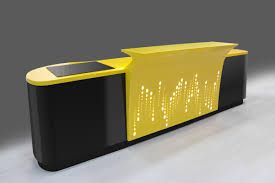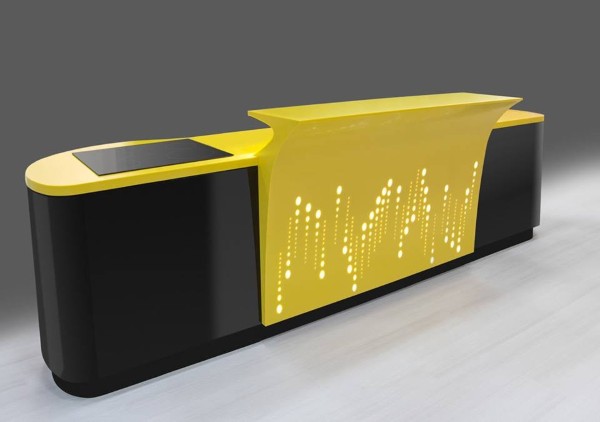 Đá nhân tạo S026 Banana ứng dụng làm quầy bar gây ấn tượng bởi màu sắc nổi bật và thiết kế trơn tru. Đặc biệt, các kiến trúc sư khéo léo sử dụng khả năng xuyên sáng của đá nhân tạo để làm nổi bật hoa văn trước mặt quầy lễ tân