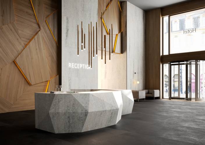 Quầy lễ tân tại một khách sạn làm từ đá solid surface VA01 Santa Ana. Dù được tạo nên từ nhiều khối đá khác nhau tuy nhiên quầy bar trông không khác gì được tạc ra từ một tảng đá lớn nguyên khối. Tạo hình lục giác với các họa tiết là đơn giản, quầy bar trở nên sang trọng mang tới vẻ đẳng cấp, thu hút.