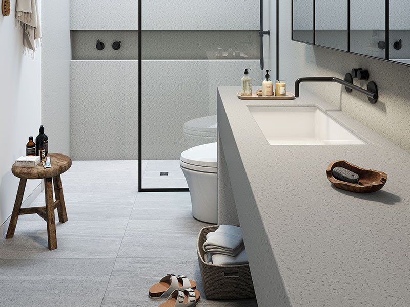 Đá Solid Surface M424 Lunar Dust được sử dụng làm lavabo trong nhà vệ sinh