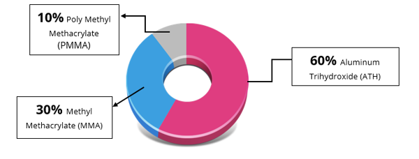 Đá nhân tạo Hi-mac được cấu tạo từ: 60% Aluminum Trihydroxide (Nhôm hydroxit), 30% Methyl Methacrylate và khoảng 10% Poly Methyl Methacrylate.