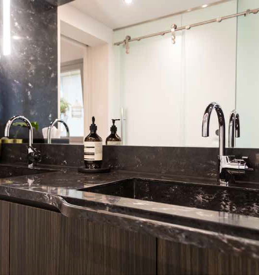 Đá nhân tạo solid surface M206 Monza ứng dụng làm lavabo và ốp bàn lavabo. Khả năng uốn cong giúp dễ dàng chế tạo ra các lavabo ứng ý. Kết hợp mặt bàn cũng được chế tác từ đá nhân tạo tạo thành một không gian khép kín liền mạch. Màu sắc sang trọng vân đá nổi bật khiến không gian trở nên ấn tượng và thu hút.