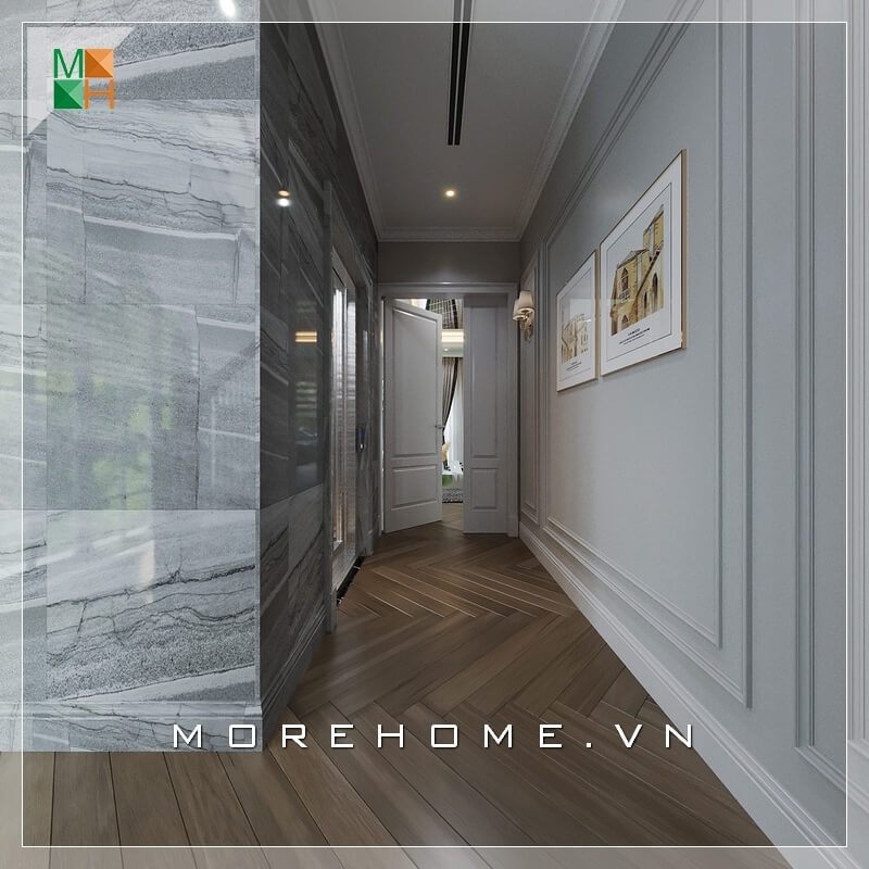 Hành lang với tường ốp đá cao cấp và sàn gỗ ấm áp gắn kết các không gian trong thiết kế biệt thự, nhà phố.
