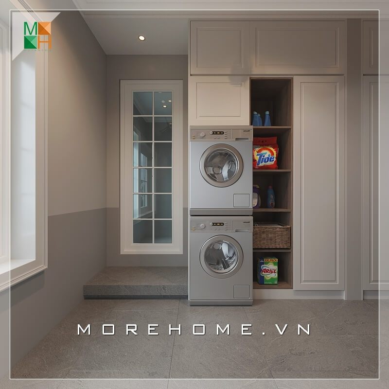 Công việc nhà sẽ không còn đáng ngại khi thiết kế nhà phố dành riêng một khoảng không gian để giặt giũ, việc bố trí nội thất, tủ chứa hết sức linh động, tiện nghi.