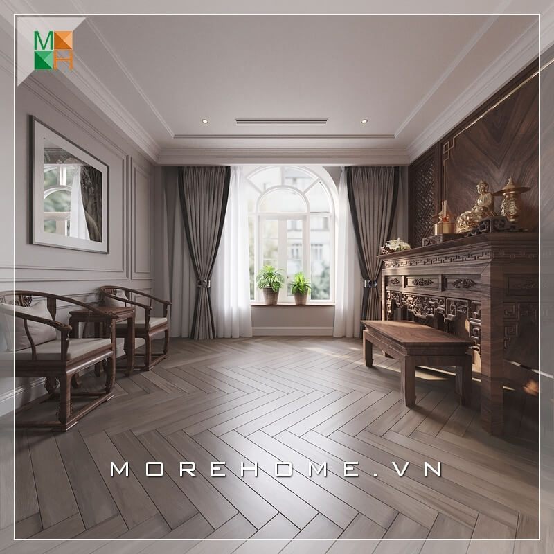 Nội thất phòng thờ dành cho nhà phố từ gỗ óc chó nâu huyền bí ấm áp là lựa chọn hoàn hảo cho không gian lnh thiêng của gia đình.