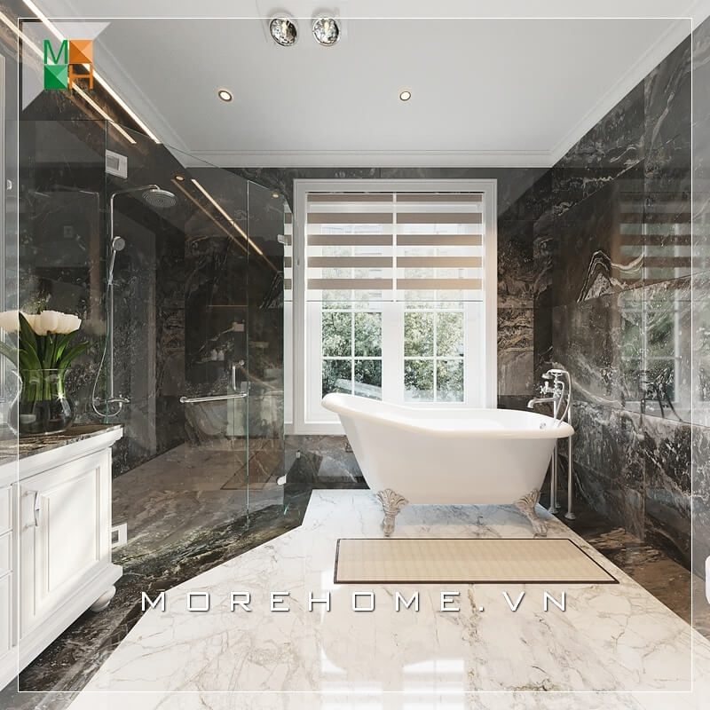 Mẫu thiết kế phòng tắm cao cấp mang vẻ đẹp sang trọng sử dụng đá ốp tường và lát sàn ấn tượng phù hợp cho không gian của biệt thự, nhà phố