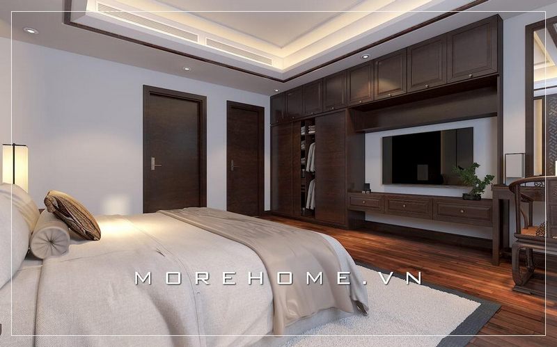 Tủ quần áo đa năng tích hợp kệ ti vi treo tường mang đến không gian phòng ngủ tiện dụng và sang trọng hơn