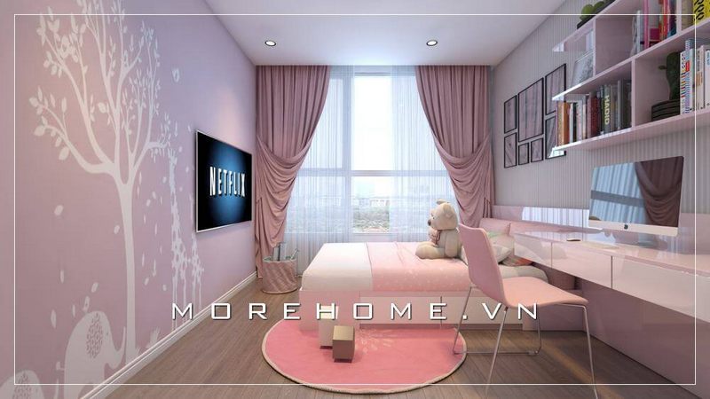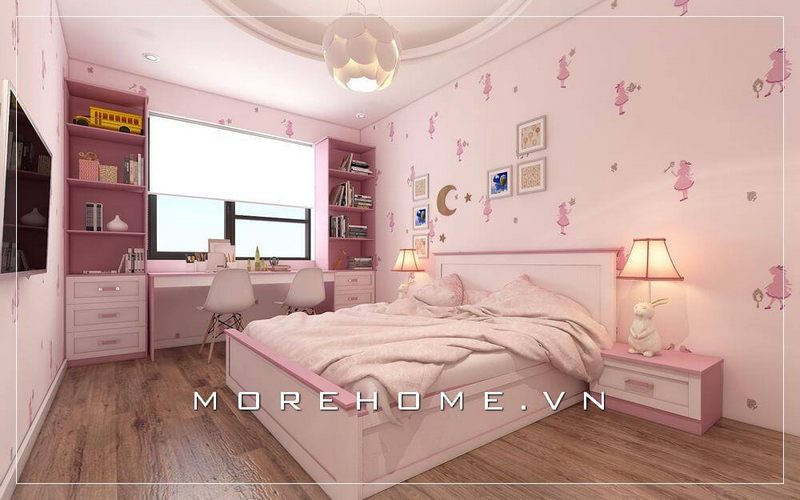 Không gian phòng ngủ của bé trở nên nhẹ nhàng khi KTS lựa chọn mẫu giấy dán tường trẻ em màu hồng thể hiện cá tính và sở thích của bé