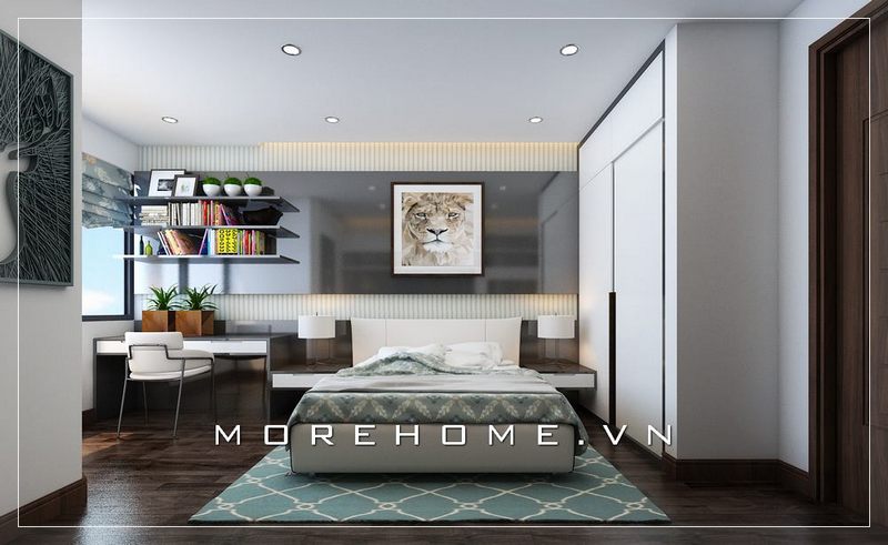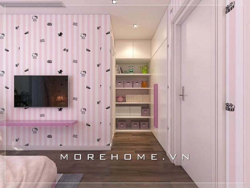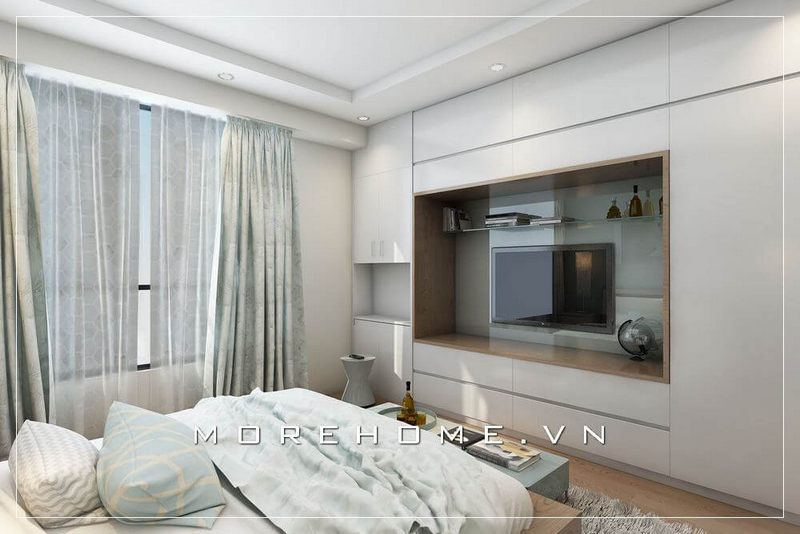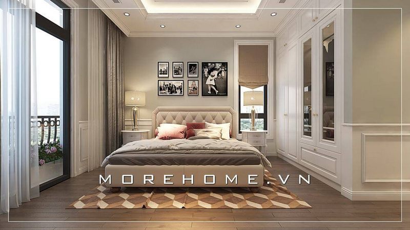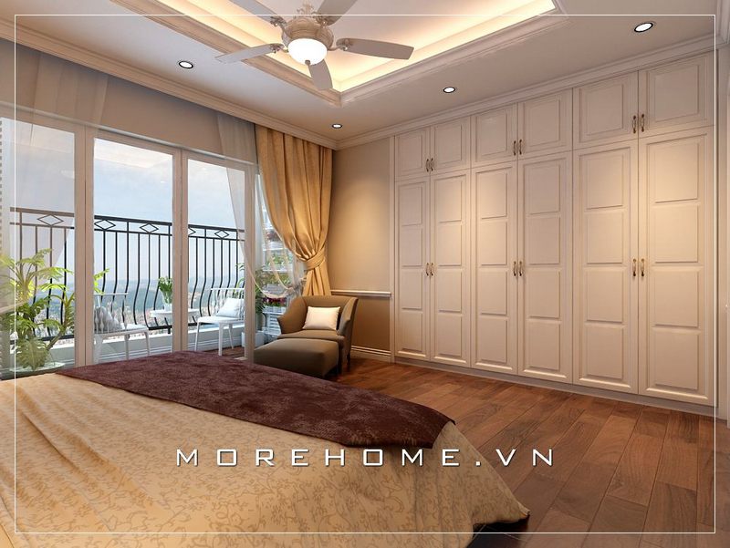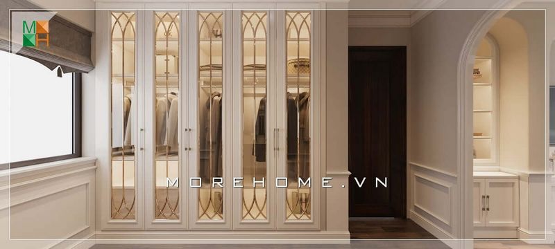 Nhằm khai thác hết các diện tích căn phòng thì thiết kế tủ quần áo tân cổ điển âm tường kịch trần màu trắng đã làm tăng độ tiện nghi và sự sắp xếp nội thất rất khoa học của KTS Morehome.