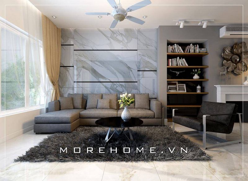 Vách ốp tường đá nhân tạo vân mây được coi là điểm nhấn ấn tượng tạo nên sự tinh tế của khu vực tiếp khách