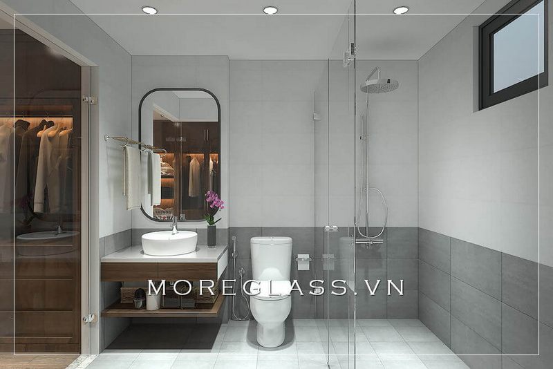 Mẫu nhà vệ sinh đẹp sử dụng kính cường lực cao cấp giúp ngắn nước vào nội thất phòng tắm và phân chia không gian khu vệ sịnh và phòng tắm