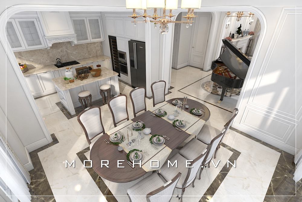Thiết kế không gian phòng bếp liền phòng ăn rất rộng rãi và thoáng mát, sử dụng đèn chùm treo giữa không gian bàn ăn mang đậm chút tân cổ điện rất đẳng cấp.