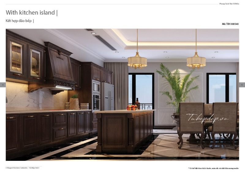 Mẫu thiết kế phòng bếp biệt thự được trang bị tủ bếp chữ I và bàn đảo bếp tân cổ điển, được làm từ gỗ óc chó sơn bóng tự nhiên và kết hợp với mặt đá nhân tạo trắng cao cấp.