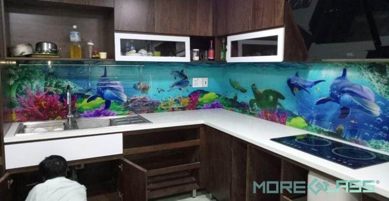 Mẫu thiết kế phòng bếp hiện đại bao gồm tủ bếp gỗ công nghiệp chữ L, mặt bàn đá nhân tạo cao cấp và kính ốp bếp in 3D có màu xanh.