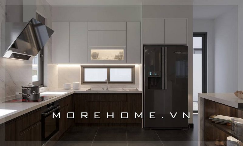 Tủ bếp gỗ acrylic màu trắng hiện đại là lựa chọn tuyệt vời để trang trí phòng bếp của căn hộ chung cư.