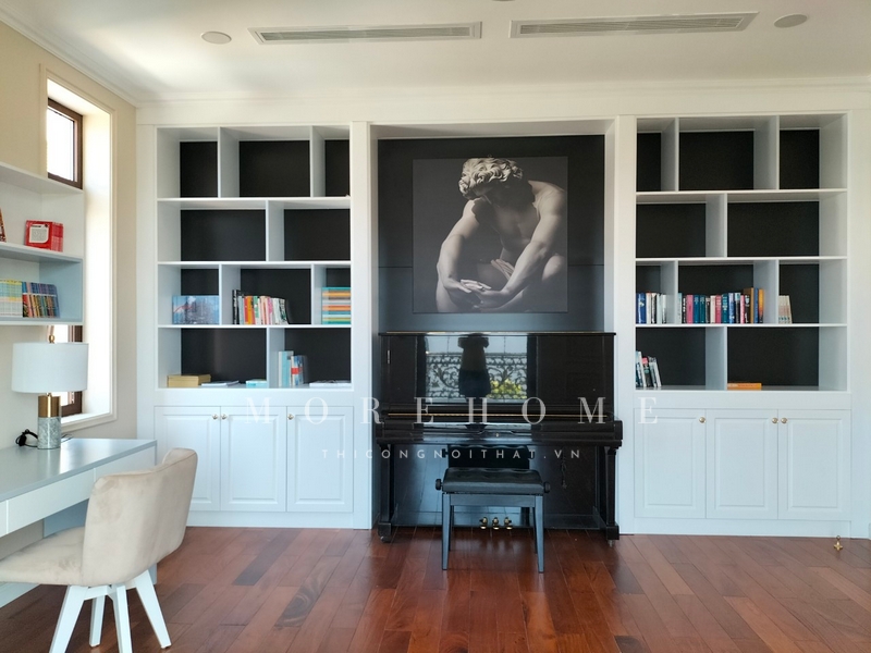Morehome đã thực hiện hình ảnh công trình thi công giường ngủ gỗ tự nhiên tân cổ điển với phun sơn màu trắng đẹp.