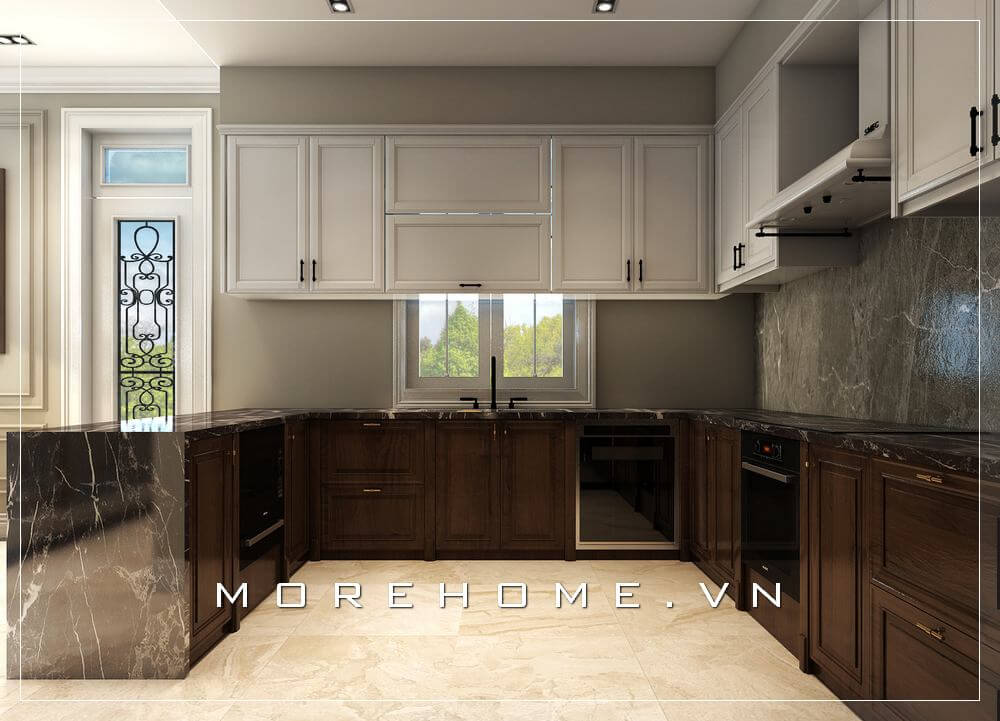 Mẫu tủ bếp chữ U gỗ tự nhiên màu nâu hiện đại, sang trọng cho phòng bếp biệt thự